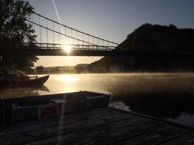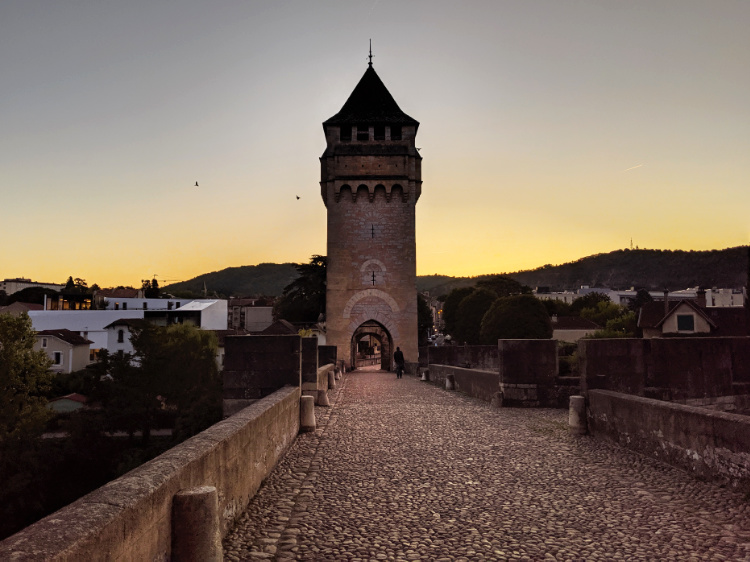A cold morning, the coldest we’ve experienced. Mist rising off the Lot River as we cross the 14th-century Pont Valentré, one of the finest fortified bridge in Europe. A stone devil clutches at a cornerstone that he’s trying desperately to dislodge in revenge for being tricked by the master bridge builder.