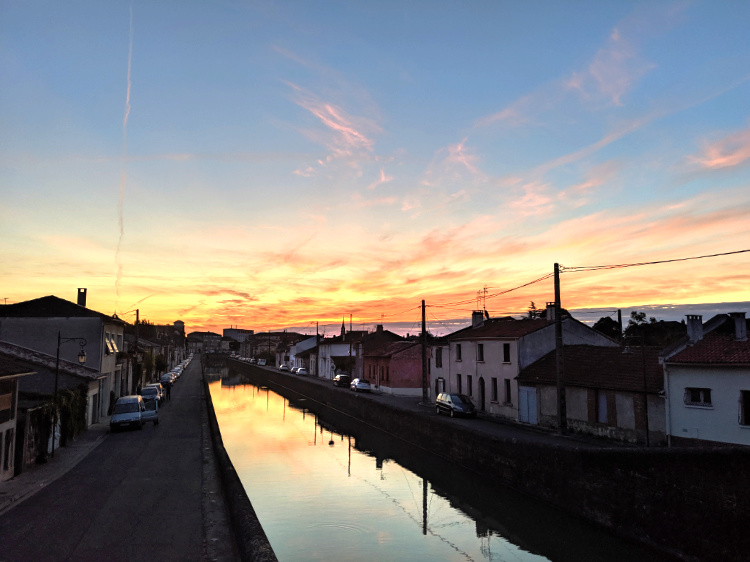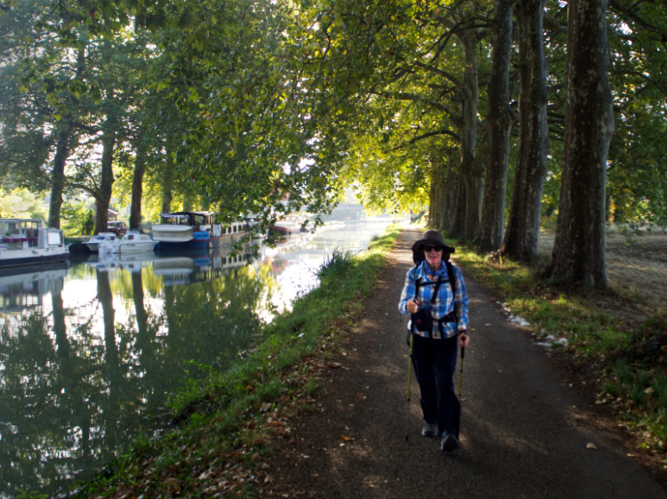 Out on the trail before sunrise, following the towpath alongside the Canal du Deux Mers. The plane trees on either side of the canal provide a tunnel of green shade and watery green light. A kingfisher flashes brightly from water to tree and back again. Canal boats make their languid way to the Canal du Midi and on to Toulouse.