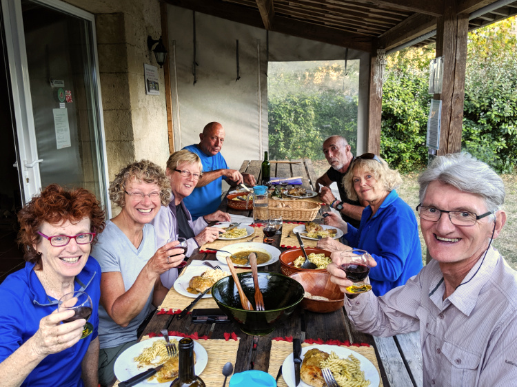 Two deer in a bare field. Frogs diving into a pond. The heat rising. A stop in Condom to take in the civility of this Gascoigne town with its lively bars and impressive Cathedral then on through the hot afternoon to Montréal-du-Gers. A much-needed beer in the shade of a deep, cool verandah and, revived, on to the gîte that we are sharing with a group of thirteen from a parish near Lyon. Christian in belief and in practice, they welcome us to their dinner table and afterwards entertain us with a performance of traditional French folk songs.