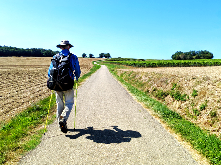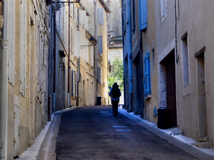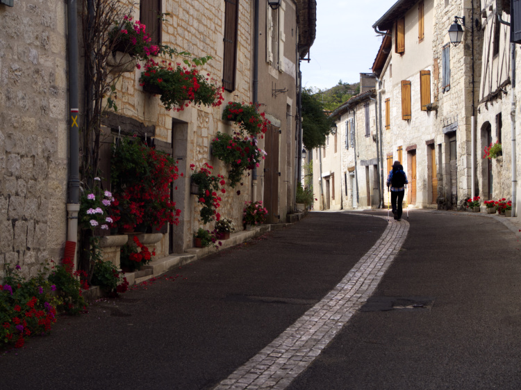 Lavender planted in rows in rocky red soil and vineyards that produce the tannic wines for which Cahors is famous. Here is this city of art and history with its narrow alleyways and half-timbered houses we say farewell to Jean-Pierre, a good man leading a good life. He has walked this route before, all the way to Santiago de Compostela, and has re-walked the first 350 kilometres of it to ease the way for his friend Jacky, a first-time Camino walker. Later today, Jean-Pierre will catch the train home to Alsace and Jacky, recently retired, will step out on the Way of St James with his son. Together they’ll walk on as far as the spirit takes them.