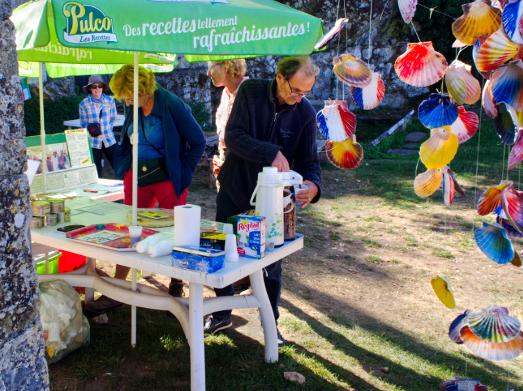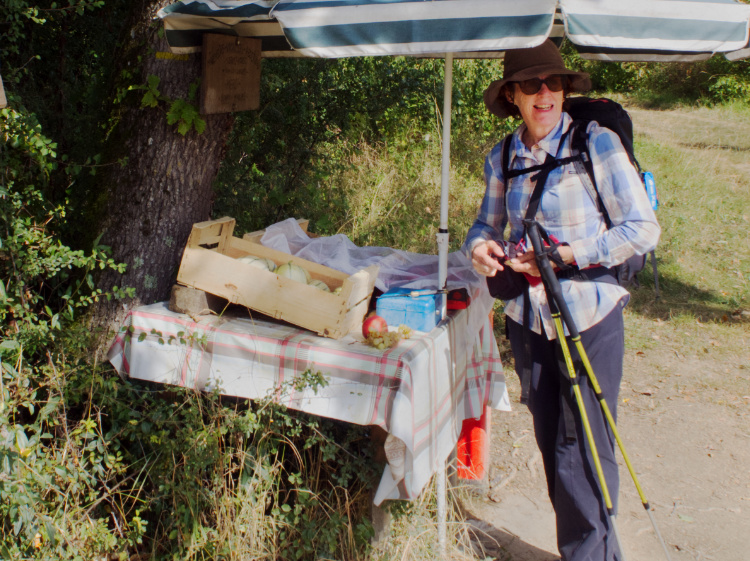 A basket of perfectly ripe peaches left outside a house for the indulgence of pilgrims. In the church in Decazeville, the most sweet-tempered of Camino angels plies us with cake and coffee and fills our pockets with treats for the journey.