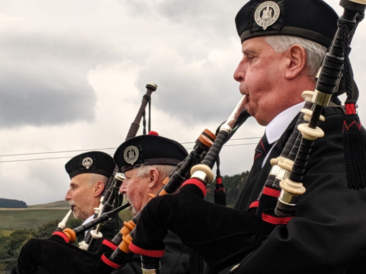 Following a stone wall uphill and down dale to Town Yetholm with its streets of thatched roofed cottages. In Kirk Yetholm we catch a glimpse of a man in a kilt walking out of a bar and soon enough see him again, playing in a pipe band at the closing ceremony of the annual shepherds’ gathering.