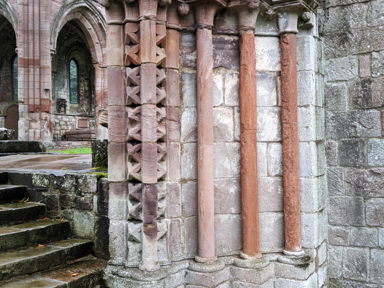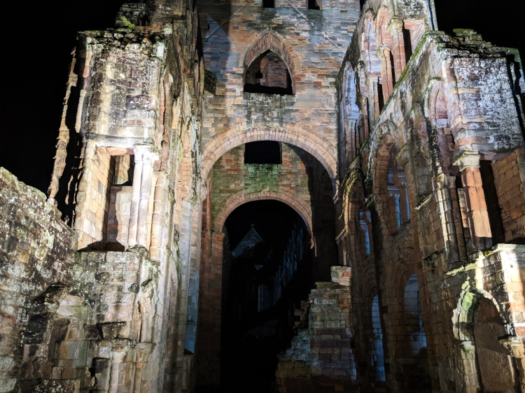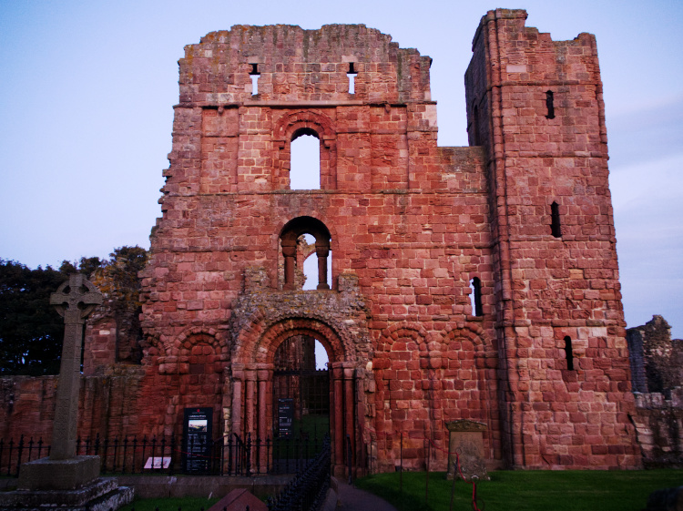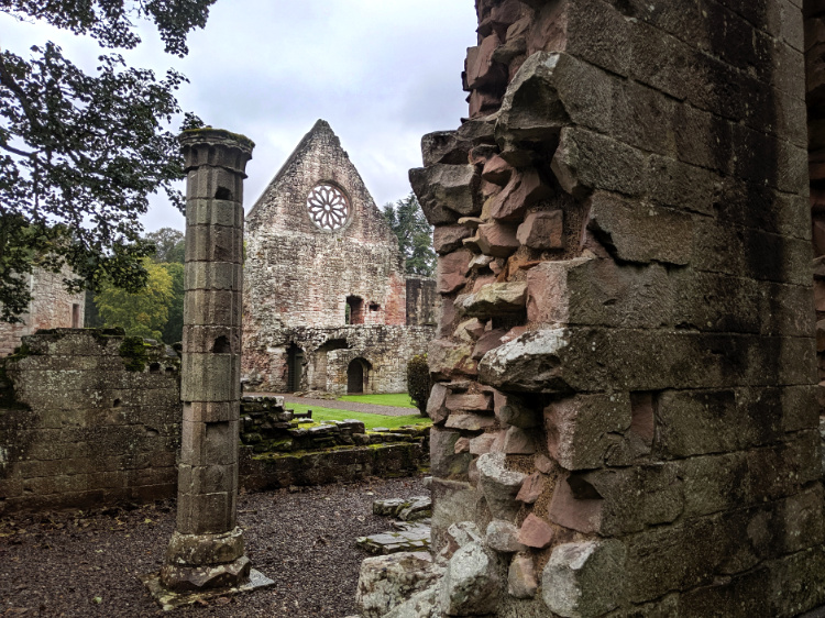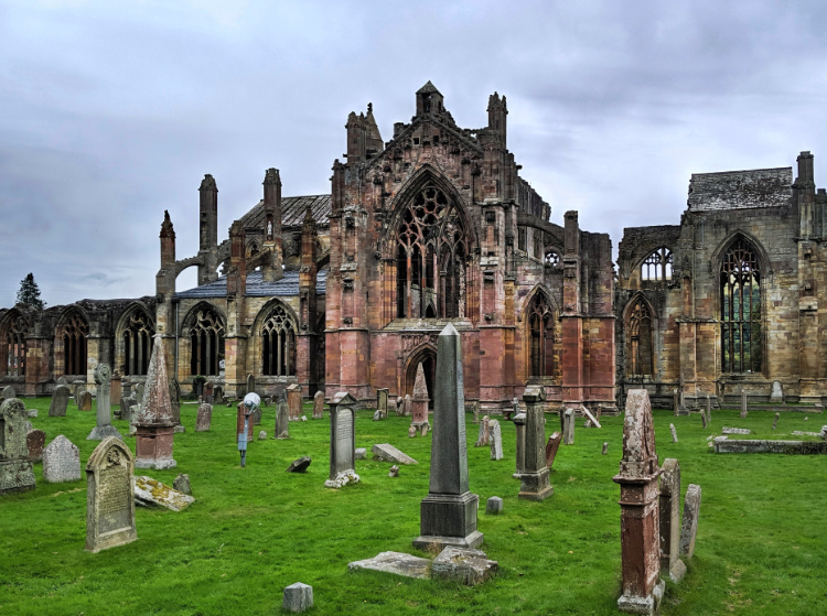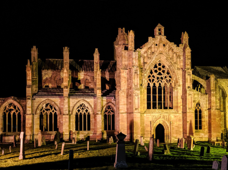 A late afternoon visit to Melrose Abbey. It was the largest and richest of the medieval abbeys in the border country until it was felled during the Protestant Reformation of 1560. Now largely in ruins, the abbey is known for its carved decorative details of saints, dragons and gargoyles. The embalmed heart of Robert the Bruce, Scotland’s warrior monarch and victor over the English at the Battle of Bannockburn, is interred here. He died and was buried at Dunfermline Abbey but not before instructing that his heart be taken on a crusade against the Moors in Spain and returned to Melrose for burial. St Cuthbert grew up nearby and was Prior at the Old Melrose Abbey before he moved to Lindisfarne.