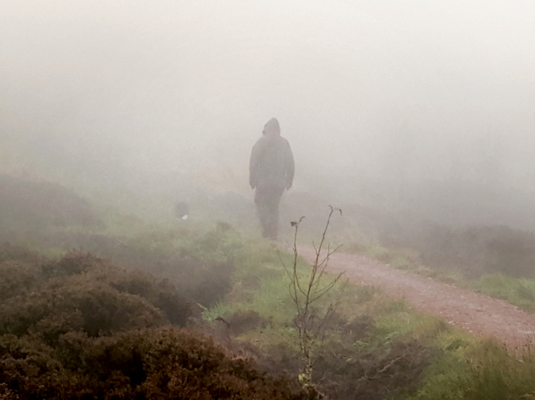 Out into the grey, drizzly day a little later than is our habit, the early morning glow gone from the sky. Up a steep, slippery path to the triple peaks of the Eildon Hills. Their summits are renowned for their splendid views that today are shrouded in mist. Almost lost in this foggy, mysterious world is a Bronze Age hillfort, one of the largest in Scotland. It was a stronghold of the Votadini tribe and a place of ceremonial gatherings before the Romans arrived with their new world order and converted it into a military signalling station.