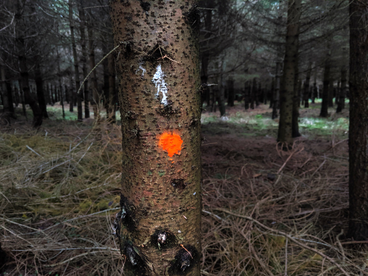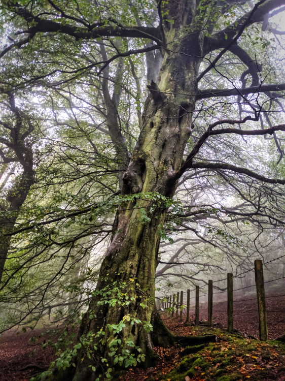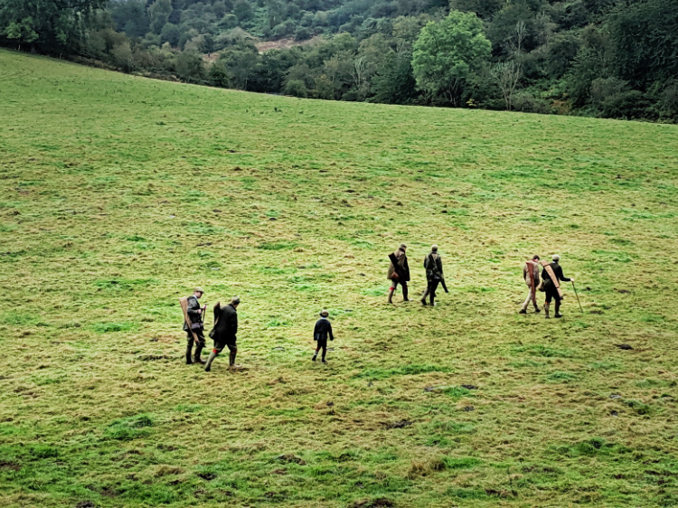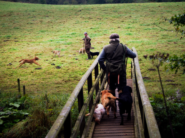 Near Oxnam Water, in a field backed by high sandstone cliffs, we come across a hunting party. Kitted out in tweed and khaki, dogs and guns at the ready, they are off into the open pasture to hunt for partridge. Later, from within the sanctuary of a beech forest, we hear the crack of a gunshot and the hiss of alarmed birds.