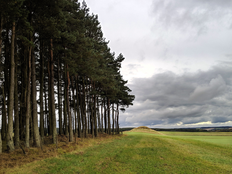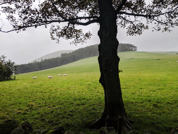 Back along a riverbank lush with ferns and on through the fair town of St Boswell. Past Maxton church (dedicated to St Cuthbert) and on to Dere Street, a Roman road constructed around 800 AD that ran from York to the Firth of Forth. We follow its straight lines through avenues of trees, alongside fields and down lanes walled with stone fences.