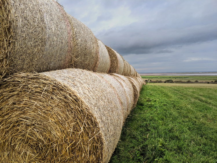 Across the River Till by way of a 16th-century bridge and on to the Devil’s Causeway, a dead-straight section of Roman road. The wind gusting but at our back. Seagulls blown inland and tossed about like scraps of paper. A covey of grouse scurrying across a field. Birds the same colour as the stubble. Rooks whirling in the sky overhead. Past a WWII concrete pillbox and on through kissing gates to a farmscape of ploughed fields and hawthorn hedgerows dotted red with berries.