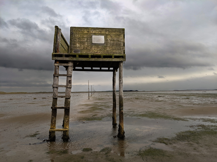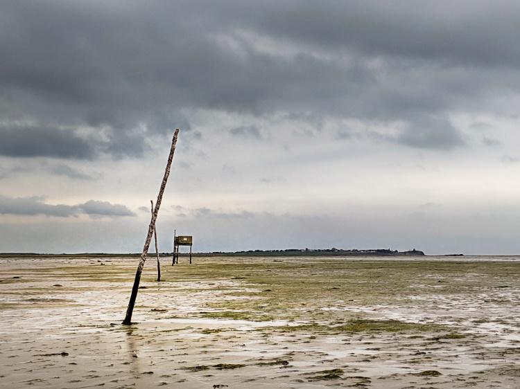 The mournful cawing and wailing of thousands of seabirds. The world flat and watery, sea and sky and land indistinguishable from each other. Even at low tide the two-hour ritual crossing is adventurous and requires navigating mudflats, sea pools and deep channels. A couple of months ago six walkers misread the tide and had to be rescued. They were knee-deep in water when they raised the alarm. Eleven minutes later, the time it took for the coast guard to arrive, they were chest-deep in water and struggling against a powerful current.