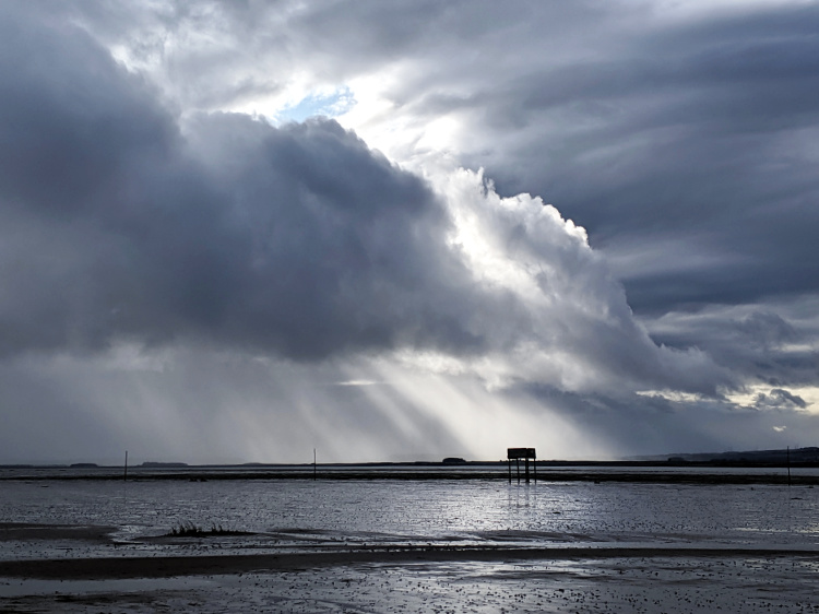 Back to the mainland. Walking via the concrete causeway this time, with a hurry to our stride. The tide is coming in and the pilgrim’s way is already calf-deep in water. Pools are forming on the causeway. Thousands of water birds feed feverishly on the soon to be inundated mudflats. Before long, the storm breaks and obliterates sea, sky and pole line.