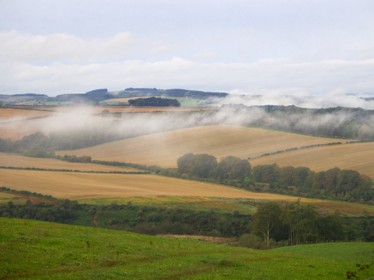 A fine morning. Fog drifting through the valley below. Gently rolling hills. A patchwork of green and pale gold. Hedgerows delineating the fields and trees tracing the meanderings of creeks. The trunks of silver birch scribbled with poetry.