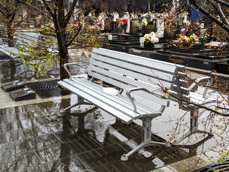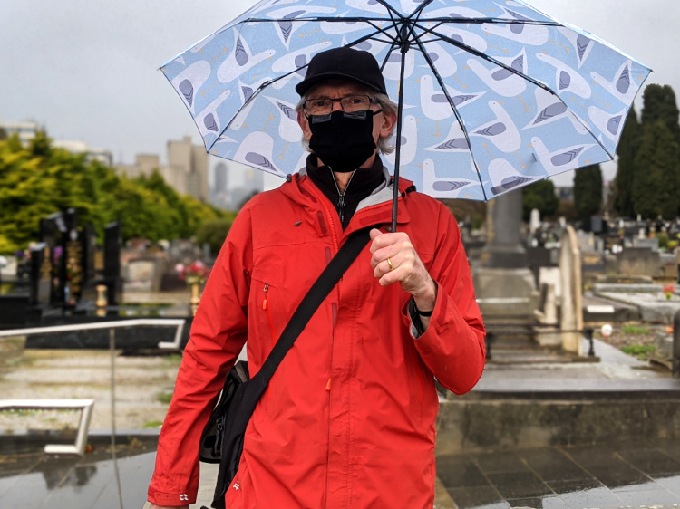 Around high noon we arrive at what some might regard as the dead heart of our walk, the Melbourne General Cemetery. As much a public park as a necropolis, it’s a place of solace and reflection in these times of uncertainty, a place that gives reassurance to life as a continuum, played out over the centuries. There are memorials to the famous and infamous but the one we notice today is in honour of an Italian born migrant whose epitaph reads It was a hoot!