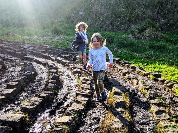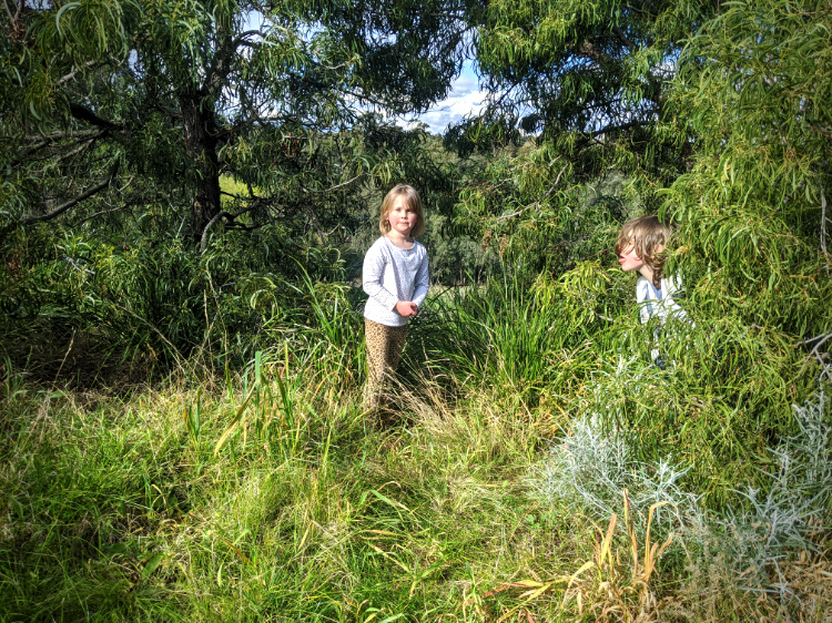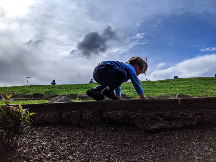 The wind starts gusting and their game playing moves to the groves of trees edging the park. They search for the most secretive of shelters to escape the mythical, mouthless monsters that we have become in the story they weave. Even though we walk almost no distance in our allotted hour, to the children’s way of seeing the world, we’ve been on a journey to an enchanted, faraway universe.