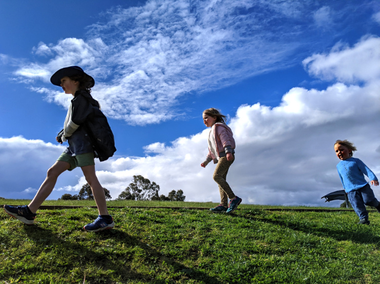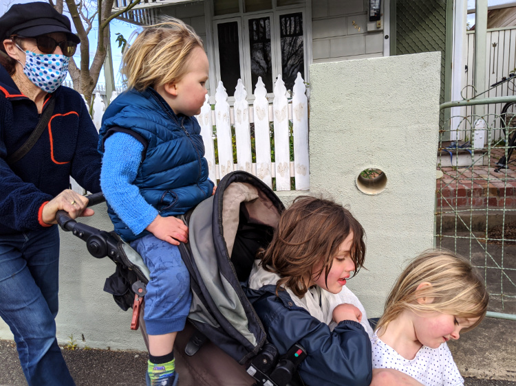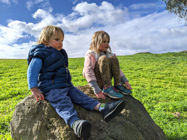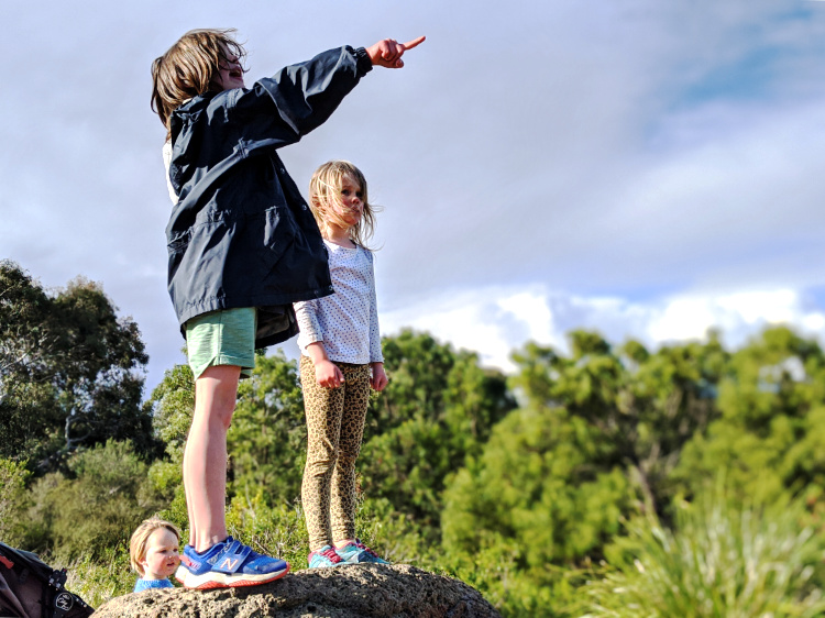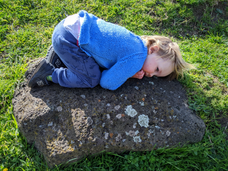 A walk with the three children in our care becomes an adventure. The playgrounds are closed but the children seize upon the rocks dotted about the landscape to create an imagined world. No sooner do they settle to watch a fantastical program on television watching rock than they run to kitchen rock for food or bed rock for a rest. Every so often they return to home rock, deemed to be the safest rock of all. When a stranger settles quietly on a rock they frighten her away, claiming it as their domain.