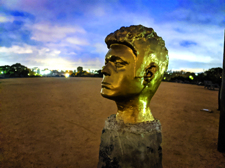 Stumbling about for a way down from the rock-walled mound, we come across Gold Head, a life-sized head on a plinth that appeared mysteriously one summer’s night earlier in the year. The Council removed it after it was found knocked to the ground, but after a public campaign the now-mythical Gold Head made a triumphant return and it stands looking out over the city. In the blue hue of dawn, it glows as a symbol of resilience and survival.