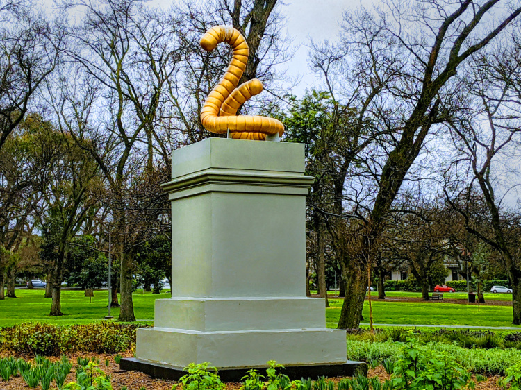 We walk on in the rain under a still-bright sky, through the quiet streets of North Carlton and the Edinburgh Gardens where the sculpture of a worm, The Unsung Hero, glows resplendently golden on its grey plinth.