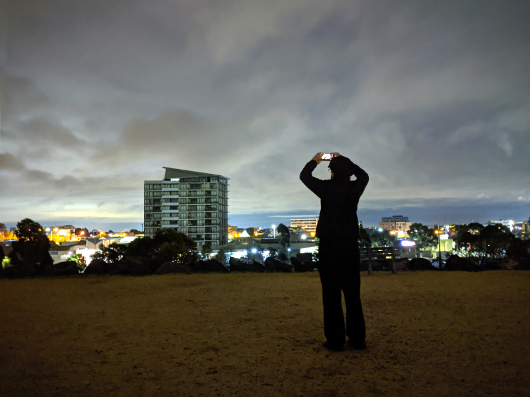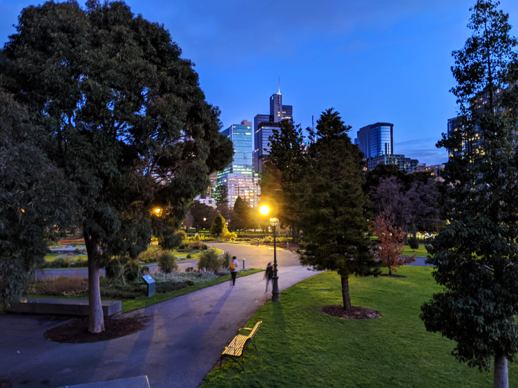 We pass a pair of tawny frogmouths on a low branch of a tree in the Edinburgh Gardens as we walk beyond the setting sun and into the blue hour.