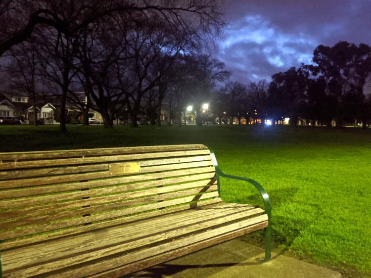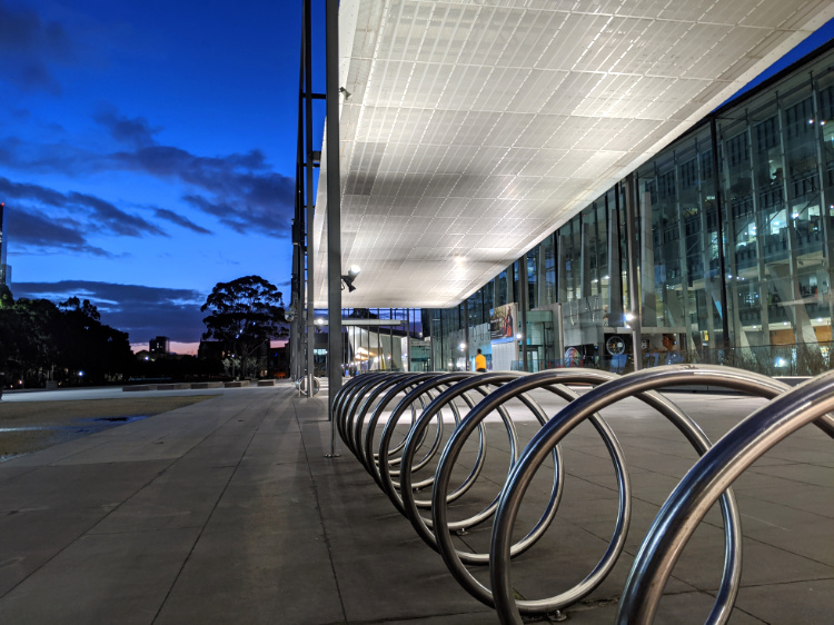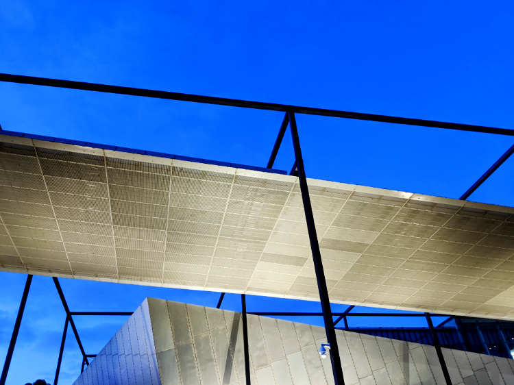 A couple of skateboarders cruise the sweeping, blue-lit museum plaza. We wander off into the gathering darkness, astronomical twilight just a breath away.