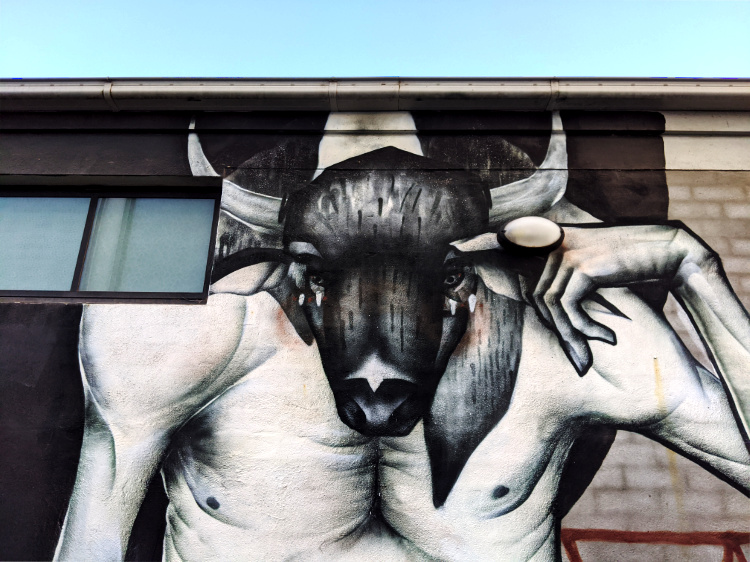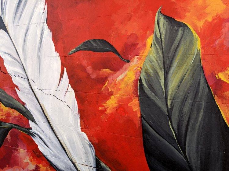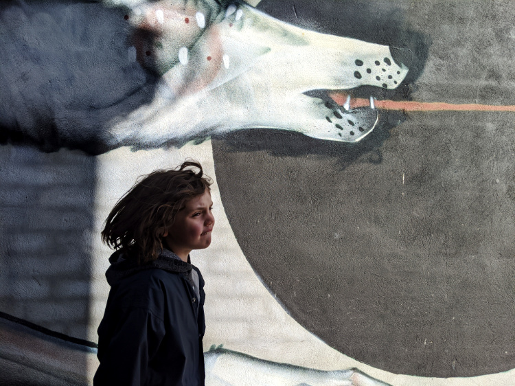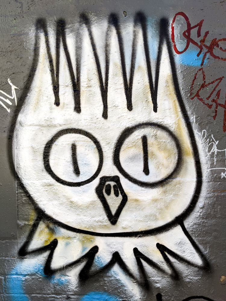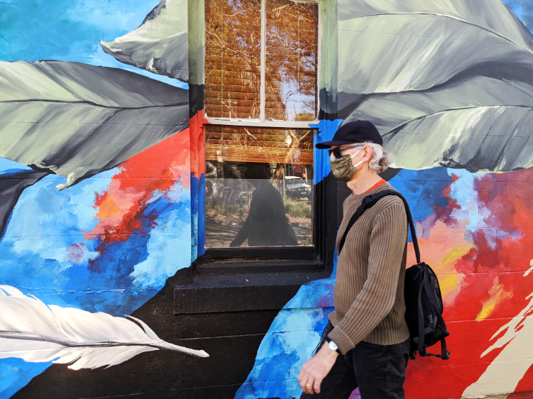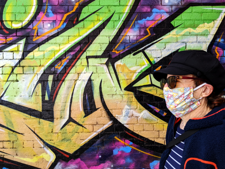 The beautiful, clear, soft light persists. Every building a complex play of sun rays and shadows. We wander through the open-air art gallery that is Collingwood. Amidst a morass of tags, there’s some striking street art. The vibrant, large-scale portraits of Keith Haring and Jean-Michel Basquiat, honouring the artists and Haring’s iconic Collingwood mural. Paintings of mythical creatures, larger than life faces and a velvet-suited rabbit urging on his rooster-drawn cart. Callum Preston’s huge, white and blue block letters making a plea for Serenity Now. A flow of leaves and feathers, detailing the intricate beauty of the natural world and the terrible destruction of last summer’s fires.