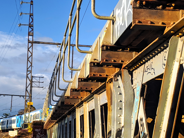 For an hour or so before sunset, with the sun low in the sky and the shadows long, the light is diffused and all shades of soft red and yellow. The golden hour. We walk across the railway bridge, its steel girders glowing like precious metal, north along the Merri Creek and then westwards, into the back blocks of Brunswick in search of golden moments.