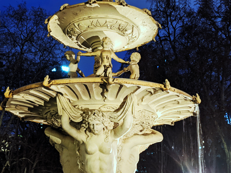 A fire flares low in the sky to the west as the sun drops below the horizon and the last of the gold drains from the light. We’ve been inside all day, held by a deluge of rain, but now we’re out and even though it’s bitterly cold, it’s exhilarating to be making our way towards the Carlton Gardens for the calm and mystery of dusk.